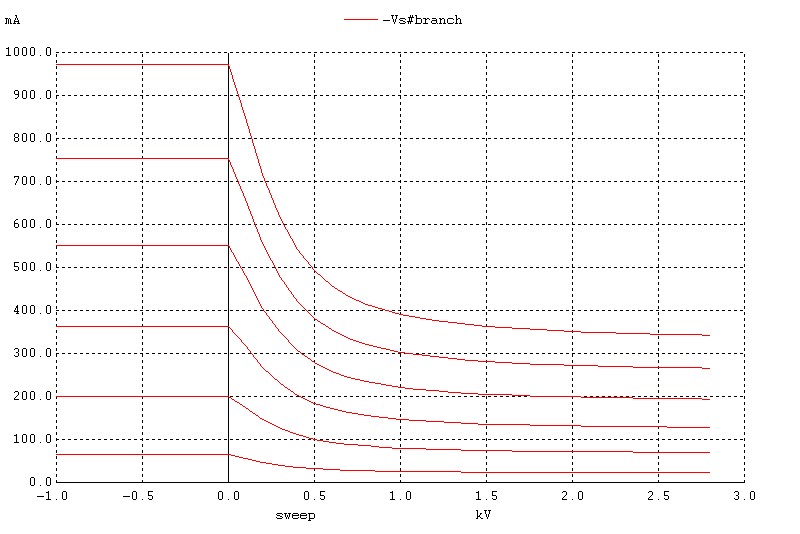 I coefficienti delle equazioni sono ricavati con un fitting sui dati ricavati dal data sheet. Ho tentato di modellare anche la corrente di griglia controllo, ma i dati di partenza sono troppo laconici per avere dei buoni risultati. Ottenute le equazioni, ho scritto un subcircuit nella sintassi di WinSpice3 e ho provato a fare qualche simulazione. Il modello sembra funzionare e, almeno con i primi test, non ha problemi di convergenza. La figura segente mostra le caratteristiche anodiche per tensioni di griglia controllo comprese fra -120V e +80V con passi di 40V (la griglia schermo è a 500V).